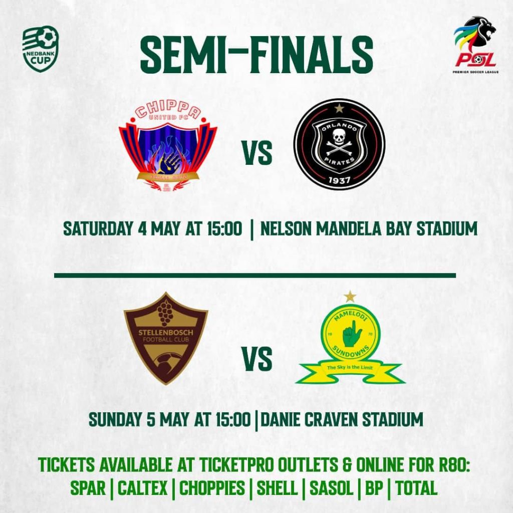 The first semifinal match is at Nelson Mandela Bay Stadium on Saturday (3pm kick-off), Chippa United host the Mighty Bucs who are the defending champions. Come Sunday 5 May also at 3pm, Stellenbosch FC will lock horns with the high flying Mamelodi Sundowns team who embarrassed Kaizer Chiefs on Thursday beating them 5-1. Chiefs scored a consolation goal from a penalty spot otherwise they could have lost the game 5-nil on the day. The big scoreline was an embarrassment to their supporters who came in big numbers to support the boys.