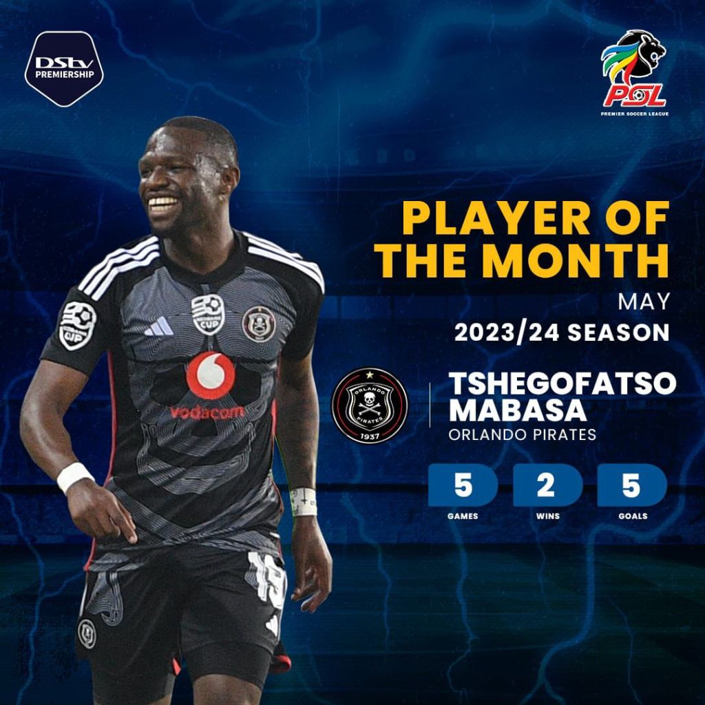 Tshegofatso Mabasa has capped off an impressive season by winning his first DStv Premiership Player of the Month award for his performances with Orlando Pirates in May, while Rulani Mokwena of Mamelodi Sundowns has been rewarded with the DStv Premiership Coach of the Month award, for the third time this season.